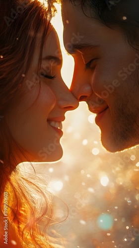 31. A close-up of a couple is faces as they smile tenderly at each other in soft sunlight