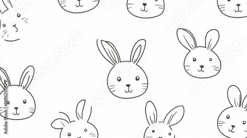 31.A seamless kawaii pattern of hand-drawn bunny faces, each with expressive, tiny eyes and soft rounded ears, neatly scattered on a clean white background. The delicate fine-line art gives a playful
