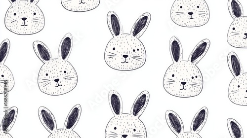 33.A charming illustration of minimalist bunny heads, evenly arranged in a seamless pattern. The delicate doodle-like style with fine black lines on a white canvas makes it ideal for baby textiles