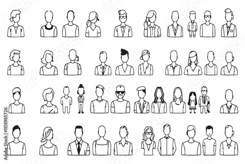 36 stylized, basic human forms are placed in four rows in this black and white line painting