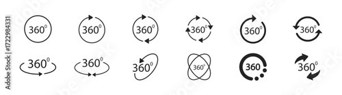360 degree rotation icon set with arrows, symbols, and graphic elements in flat modern style. Vector illustration on transparent background.