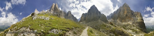 360° panoramic view of the Langkofel and Plattkofel massif near the Langkofelhuette hut, Val Gardena, province of Bolzano-Bozen, Italy, Europe