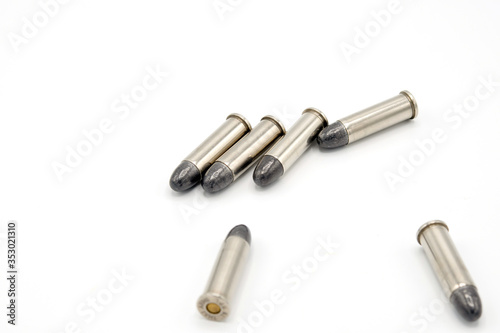 38mm bullet 6 silver bullets for a short gun on white background.