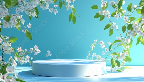 3D podium with spring floral and spring leaf background ,minimalist style