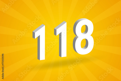 3D 118 number font alphabet. White 3D Number 118 with yellow background