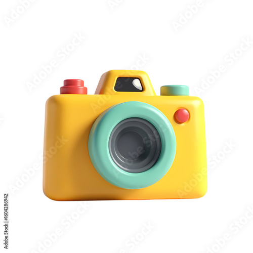 3d A yellow cartoon camera with a gray lens and a blue button isolated on transparent background