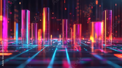 3D abstract bar graph glowing on a vibrant tech grid, depicting continuous business progress.