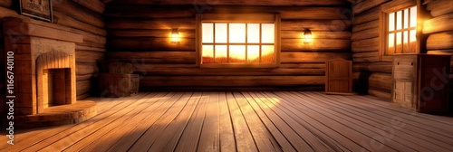 3D animated old west living room, wood interior, well lit, 1800s interior design