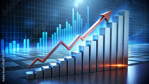 3D bar chart illustration of city skyline with upward arrow, representing business growth and market success