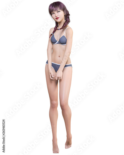 3D beautiful summer beach blond woman blue swimsuit bikini.Summer rest.Conceptual fashion art.Seductive candid pose.Realistic render illustration.Isolate