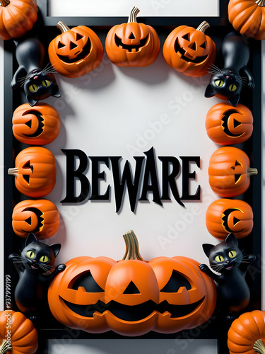 3D Black Cat and Pumpkin Border with Beware Text concept as A sleek border frame featuring black cats and pumpkins around the edges with the word Beware in a bold mysterious font. The design includes