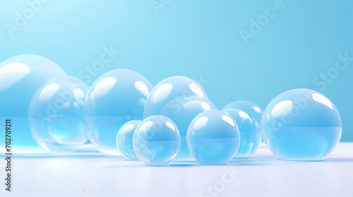 3D blue spheres of different sizes and transparency. Pastel colour pallet. Abstractive background. Generative AI