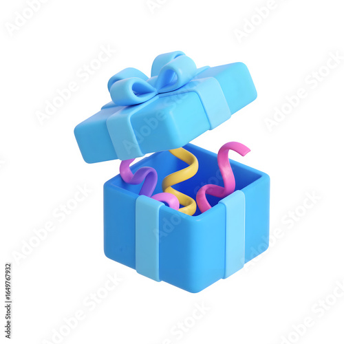 3d Bright Blue Open Gift Box with Colorful Ribbons and Bow transparent background