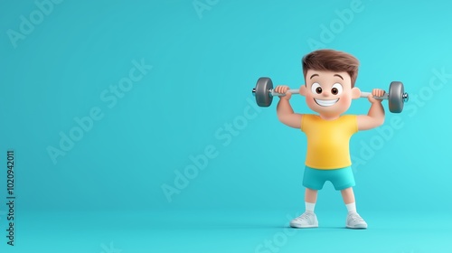 3D cartoon athlete lifting dumbbells with a cheerful expression, promoting fun and wellness through fitness