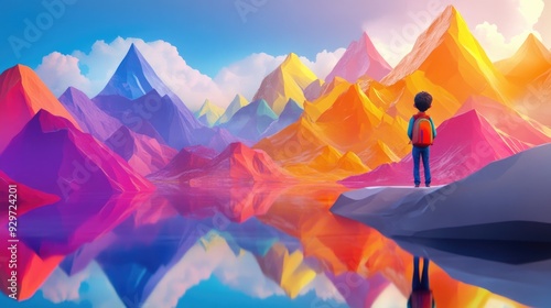 3D cartoon boy gazing at colorful mountains and a shimmering lake with reflections