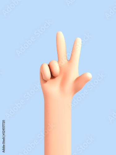 3D cartoon human hand showing two fingers isolated on blue background. Love and peace. Peace gesture hand icon. Vector 3d illustration.