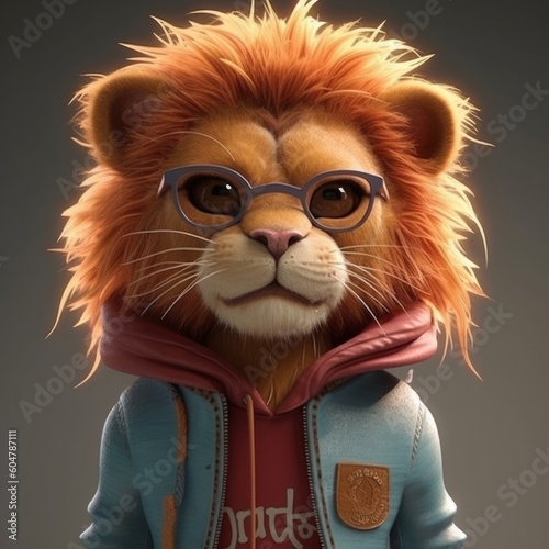 3D cartoon lion portrait wearing clothes, standing in front, generative ai