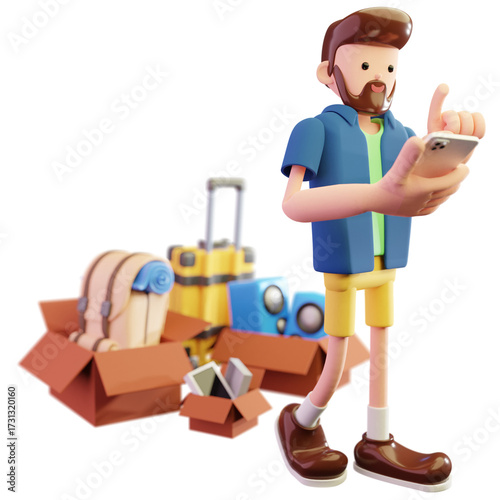 3D Cartoon Man Using Smartphone Next to Luggage in Cardboard Box on Transparent Background