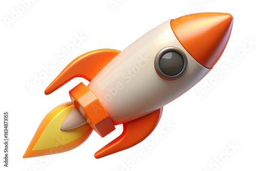 3D cartoon rocket ship launching with fiery exhaust isolated on transparent background