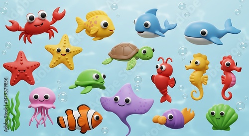 3D Cartoon Sea Animals. Underwater Creature Collection