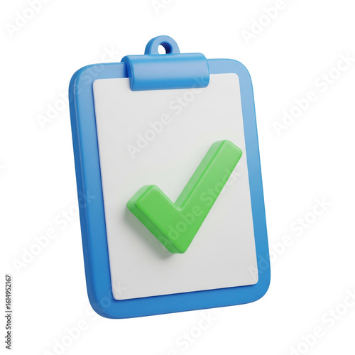3D checklist clipboard icon with green checkmark and blue frame isolated on transparent background