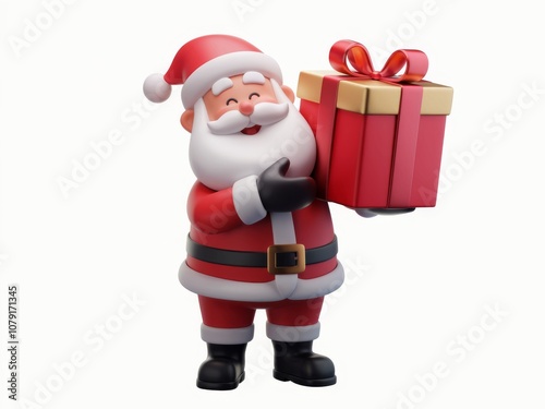 3D Cheerful Santa Claus in Red Suit with White Beard and Large Gift Present against White Background