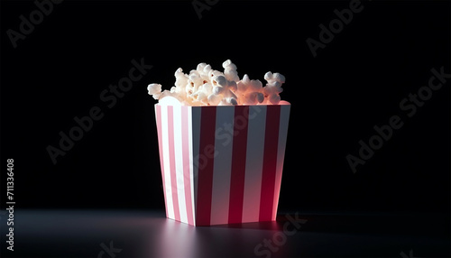 3d Cinema Movie Concept Popcorn Bucket with popcorn flying around Plasticine Cartoon Style. Neon light 3D illustration of Leisure Film. Movie theatre, cinema concept on black background