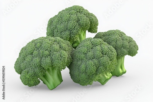 3D Close up of four fresh broccoli florets on a bright white background