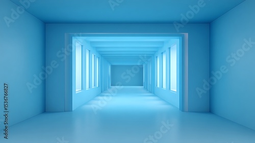 3D corridor with columns in a modern architectural interior, Blue stone arches and columns in a gothic architectural style, Empty underground hallway with doors and lights in a modern building.