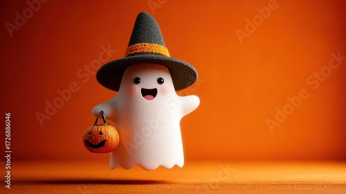 3D Cute Kawaii-Style Halloween Ghost Character: Ghost in Witch Hat with Pumpkin Bucket on Orange Background, Minimalistic Design
