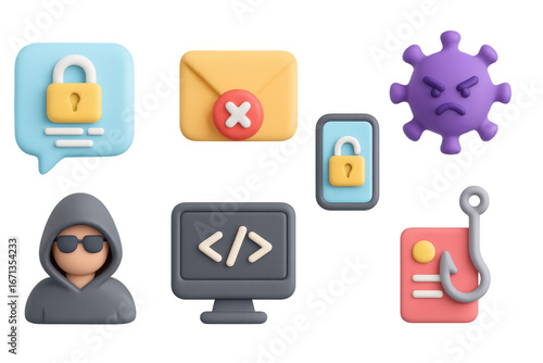 3d cybersecurity icons: hacker, malware, and phishing elements