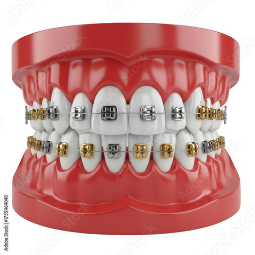 3D dental model showing upper and lower teeth with metallic and gold braces isolated on transparent background.