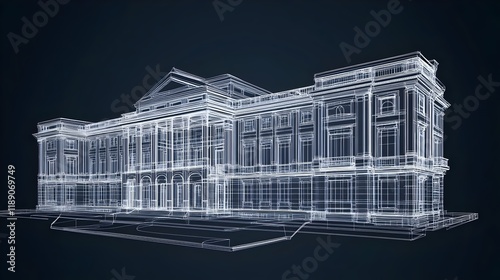 3D digital blueprint or wireframe representation of a house. concept for architectural design, 3D modeling, or construction planning. a Victorian-style house, showing detailed structure and blue illum