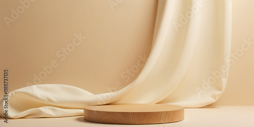 3D display podium, brown background with wood frame pedestal and flying silk cloth curtain. Nature wind. Beauty, cosmetic product presentation stand. Luxury feminine mockup 3d advertisement