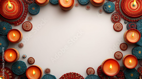 3D Diwali Lanterns & Mandala Patterns Cultural Border Frame with Intricate Copy Space for Text and Designs on White Background