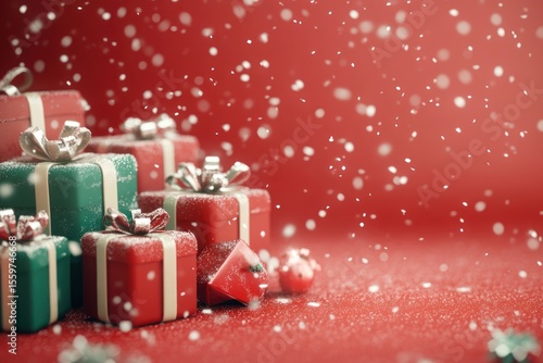 3D festive template with red and green presents, snowflakes falling, cozy holiday feel