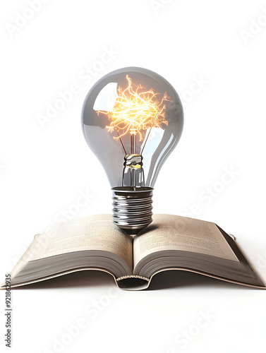 3D Flat Icon Book and Lightbulb Concept: Spark of Ideas and Innovation in Education with Whimsical Background for TextGraphics Isolated White
