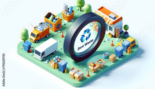 3D Flat Icon Illustrating Zero Waste Initiatives with Magnifying Glass in Isometric Scene