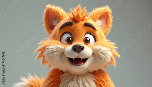 3d fluffy comic character fur face texture with emotion expression render. Cartoon fuzzy curly head in hat with color eye, mouth and teeth. Cute furry wool mascot tired, created with generative ai