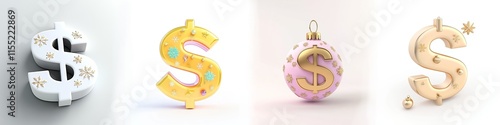 3d font design christmas theme concept. Four stylized dollar signs appear in various colors and textures, representing wealth, finance, and economic concepts.
