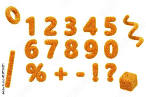 3d fur fluffy numbers from 0 to 9 with percent sign, question mark, exclamation, plus, minus symbol. Abstract geometric shapes cube, ring, spiral line with yellow orange hairy texture. 3D illustration