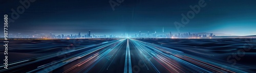 3D futuristic road at night, city skyline far in the distance, ultra-realistic detail, glowing pathways and modern architecture