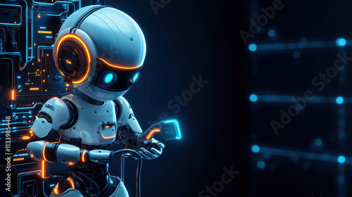 3D Futuristic Robot Mechanic Repairing High-Tech Plumbing with Illuminated Tools in Clean, Minimalist Background