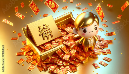 3D Glossy gold background with red envelopes scattered and copy space above. concept as A glossy gold backdrop with red envelopes scattered across the top symbolizing prosperity and good luck during L