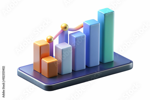 3D Glowing Abstract Bar Chart with Rising Data Streams Symbolizing Growth and Financial Success � Upward Movement of Performance on Isolated White Background