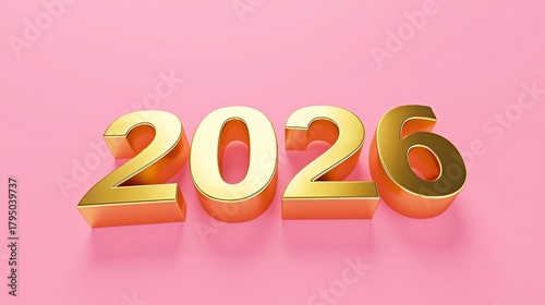 3D golden text '2026' on a pink solid background, vector illustration, with metallic texture and glossy effect, leaving white space, suitable for professional high-resolution design.