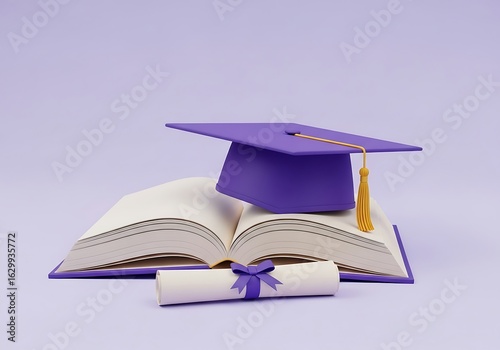 3d graduation cap on open book with diploma scroll, symbolizing education