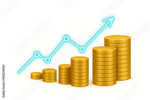 3d Graphique linéaire néon turquoise avec pièces d'or empilées — croissance financière, investissement et analyse économique