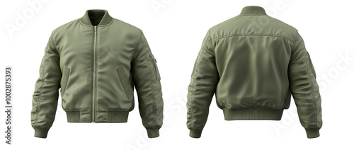 3d green man bomber jacket front and back view. Blank mockup for branding on transparent cutout background, PNG file. Mockup clipart template