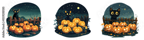 3D Halloween pumpkins with black cat isolated on transparent PNG background for spooky and festive Halloween designs